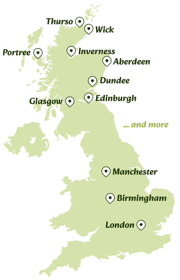 We provide private transfers to and from key airports, ports, and towns across Scotland: